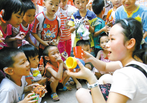 (更多报道见A3版) 5月17日是我国第十九个全国助残日。当天,40多名青年志愿者在省残联、团省委的组织下,来到省聋儿康复中心开展帮扶联谊活动。志愿者为孩子们表演节目,陪孩子们做游戏,还给他们送去了玩具。图为志愿者为孩子们表演魔术。 本报记者 林萌 摄