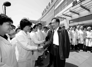 | 5月17日,温家宝和李克强等在北京地坛医院门诊楼前看望医护人员,向大家表示慰问。 新华社记者 饶爱民 摄 |