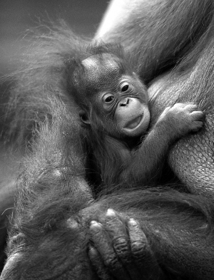→五月十八日,在英国切斯特的一个动物园,一只刚出生不久的婆罗洲猩猩依偎在妈妈怀里。 新华社/路透