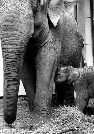 ←五月十七日,在比利时安特卫普的一个动物园,一只当天出生的小象依偎在妈妈身边。 新华社/路透