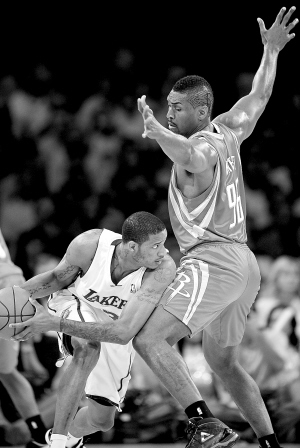 | 5月18日,湖人队球员阿里扎(左)伺机突破火箭队球员阿泰斯特的防守。 新华社发 |