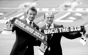 5月18日,英格兰球员贝克汉姆(左)和鲁尼在伦敦的温布利球场打出英格兰申办2018年世界杯的标语。 英格兰足总3月16日向国际足联同时递交了2018年和2022年世界杯赛的申办书。 国际足联执委会将在2010年12月底宣布获选者。 新华社发