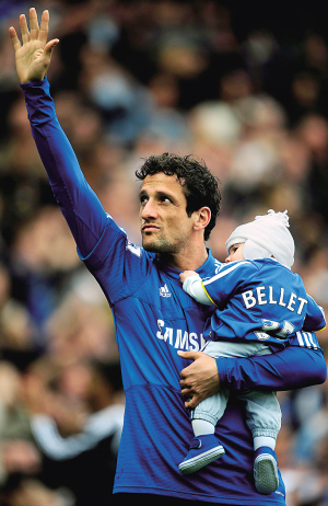 5月17日,在英超联赛第37轮的一场比赛中,切尔西队以2比0战胜布莱克本队。图为切尔西队球员贝莱蒂怀抱婴儿向球迷挥手致意。 新华社发