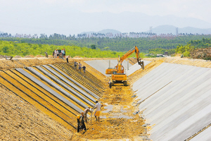 5月14日,在大广坝水利水电二期(灌区)工程施工现场,工人们正在冒着烈日加紧施工。截至今年4月15日,大田分干及支渠和红泉分干建设已基本完工,目前正在完善水土保持设施,累计完成投资4.32亿元,占总投资的32.02%。 本报记者 张杰 摄