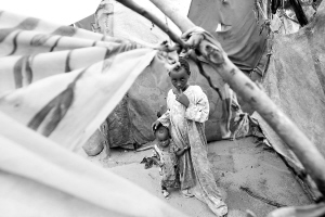5月21日,在索马里摩加迪沙郊外一处难民营,两个孩子站在简陋的帐篷外。联合国儿童基金会20日说,在索马里反政府武装近日占领中部重镇乔哈尔并洗劫当地食品和医疗储备后,5万多名严重营养不良的索马里儿童的生命受到威胁。 新华社/法新 反政府武装劫掠 索5万多儿童生命受威胁