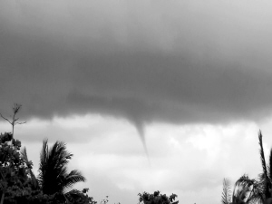 今天中午12时28分,受南海辐合带中对流云团影响,在西沙永兴岛南方3000米以外海面,出现了海龙卷,给海面带来阵雨天气。西南中沙群岛气象台副台长陈长丘告诉海南日报记者,当时,他们观测到西南角方向半空中出现了一朵很黑的乌云,云端还垂下一条有弧度的巨型灰色“吸管”(见右图,陈长丘摄),当即意识到是出现了海龙卷。