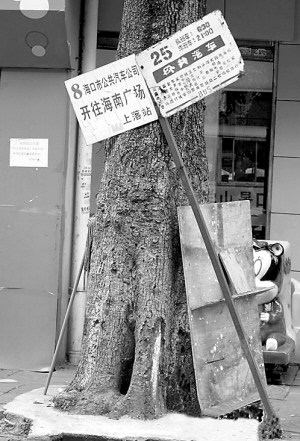 | 解放东公交站牌靠树而站 南海网记者 陈望摄 |