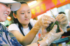 本报海口5月23日讯 (记者高虹)粽叶、野菠萝叶、五花肉、素糯米等包粽子所用的原材料一一摆放在桌上,随着主持人一声令下,游客们便手忙脚乱地包起了粽子……今天上午,海口火山群世界地质公园举行一场别开生面的包粽子活动。金鸡状、火山状、钱包状等形态各异的火山特色粽子让50多名游客们大饱眼福。