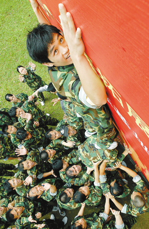 5月23日,烟雨濛濛的南丽湖畔,50多名海口市龙华区各中、小学少先队辅导员、团委书记参加天涯拓展训练,他们表示学到的拓展方法将有利于开展对青少年的训练,提高青少年团队意识。图为全体队员在“勇攀高峰”项目中依靠协作在10分钟内翻越4.5米高的障碍。 本报记者 苏建强 摄