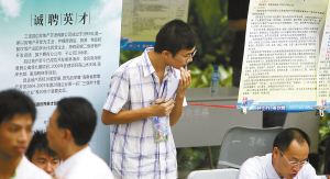 上图:一名海大学生正在观察招聘单位的面试。 本报记者 李英挺 摄
