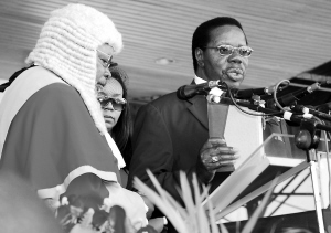 5月22日,马拉维总统宾古·瓦·穆塔里卡(右)在布兰太尔宣誓就职。马拉维于本月19日举行新一届总统和议会投票选举。结果表明,穆塔里卡以压倒性优势赢得总统选举,获得连任。 新华社/路透
