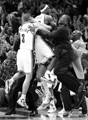 当詹姆斯推开特科格鲁弧顶接球投中后仰三分之后,全场20562名球迷简直不敢相信自己的眼睛,对于克里夫兰人来说,这是一个足以将他们从当年乔丹在克雷格·伊洛头上停留若干秒之后完成绝杀阴影中解脱出来的历史性投射,为勒布朗送出界外传球助攻的莫里斯·威廉姆斯也兴奋到极致的跪在地上不断用拳敲击地板。