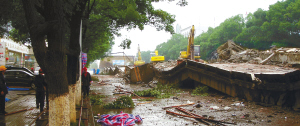 | 5月19日,株洲市红旗中路,雨中的塌桥更显悲怆。 海南日报记者 郑彤 摄 |