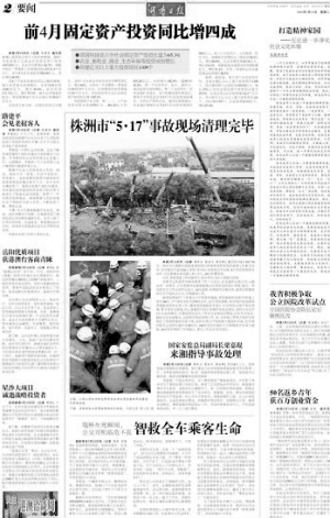 以5月19日的《湖南日报》为例,该报在要闻版拿出约1/2的版面对此事予以关注。而当天的《株洲日报》甚至用了头版一个整版予以报道,信息涵盖救援动态、领导视察、市政部署、保险赔付、交通管制、菜场搬迁等。省会的市委机关报《长沙晚报》也在封面版刊发巨幅照片的同时,推出半个版的“热读”专版关注此事。
