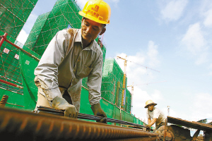 | 5月24日,工人在海口金玉广场工地切割钢筋。 本报记者 古月 摄 |