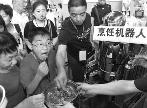 23日,一款全智能操作的烹饪机器人在北京科博会上吸引了众多观众。 新华社发