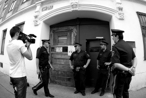 | 5月24日,奥地利警察在首都维也纳发生枪击事件的一座印度教寺庙门口执勤。