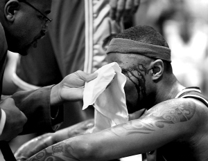 | 莫·威廉姆斯(右)血洒赛场。 新华社发 |