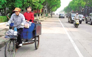 踏车的是一位女人,不知道是女孩的妈妈还是外婆。如果说是妈妈,这位妈妈显得有点老;如果说是外婆,那这外婆又略显年轻。这位女人正向前倾,一扭一扭小心翼翼地踩着车。路过路边设的垃圾箱了,就停下车,把里面的垃圾扫起,非常小心地倒在垃圾车箱里的一个角落,尽量不让垃圾接触到红衣女孩的身体。