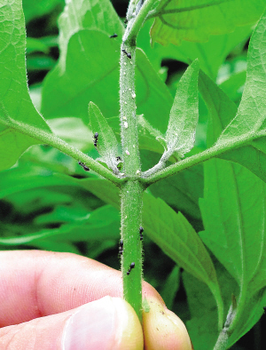 ②飞机草上的蚜虫。