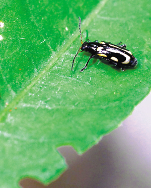 记者在海南师范大学生命科学院试验园里看到,种植在花盆里的外来入侵物种飞机草、水花生、假臭草,叶片上已被龟甲虫、莲草胸跳甲、蚜虫等三四种昆虫啃食得遍体鳞伤,个别植株已死亡。在一株水花生的叶片上,一对龟甲虫正在交配,忙着繁衍后代,更有部分幼虫已变成了蛹。