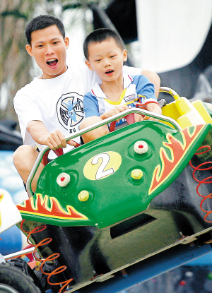 | 五月三十日,在白沙门儿童乐园,一位家长和孩子一起游玩。 本报记者 林萌 摄 |