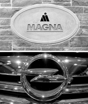 | 这是麦格纳标志(上)与欧宝汽车标志的拼版照片。 新华社/法新 |