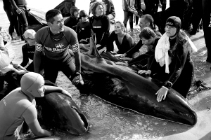 5月30日,在南非开普敦附近的科梅奇海滩,专业救援人员和志愿者试图将搁浅的巨头鲸推回水中。当天上午,数十头巨头鲸在此搁浅,但在人们的帮助下它们又回到了大海。 新华社/法新