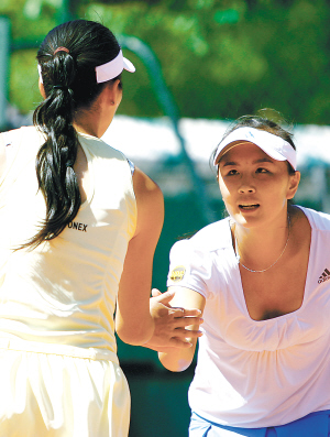 彭帅/谢淑薇进女双八强 5月30日,中国选手彭帅(右)和中华台北选手谢淑薇在法网女双八分之一决赛中,以2比0战胜汉图楚娃/杉山爱,打入八强。 新华社发