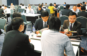 6月1日,两岸企业代表在台北参加“三下乡商机 两岸经贸合作洽谈会”对口洽谈活动。当日,被台湾媒体誉为“采购首发团”的“两岸经贸促进考察团”展开在台的系列政策说明及采购洽谈活动。在台期间,35家大陆知名企业将与台湾的200多家企业进行460多场对口洽谈。此次来台考察和洽购的大陆企业由海峡两岸经贸交流协会与大陆家电、机电、轻工、纺织、五矿等多家商协会共同组织,参团的企业主要由“家电下乡”中标企业及轻工、食品加工和销售企业组成。 新华社发(吴景腾 摄)