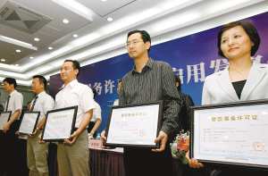 6月1日,我国首批“餐饮服务许可证”在启用发放仪式上颁发。当日,国家食品药品监督管理局在上海举行“餐饮服务许可证”启用发放仪式,7家通过审核的餐饮企业获得首批“餐饮服务许可证”。 新华社记者 刘颖摄