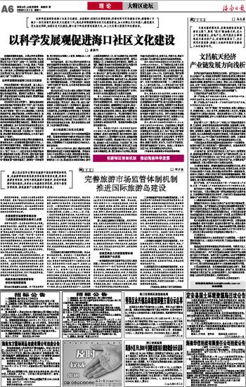 科学发展观的第一要义是发展,核心是以人为本,基本要求是全面协调可持续,根本方法是统筹兼顾。解决海南文化建设发展的问题,就需要本着这样的指导思想。要把海口发展成为“温馨宜居”,具有浓郁地域文化特色的城市,需要因地制宜地发展社区文化事业。