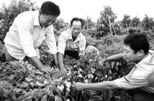 | 中国热带农业科学院热带蔬菜研究中心副主任曹振木(右一)在陵水种植户谌瑞华(左一)的热辣———2号新品黄灯笼辣椒基地察看。 本报记者苏晓杰摄 |