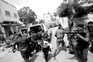 6月4日,在约旦河西岸地区卡勒基勒亚,巴勒斯坦民族权力机构警察在与哈马斯成员交火中疏散人员。巴勒斯坦民族权力机构警察当日上午在卡勒基勒亚与哈马斯成员发生枪战,造成至少1人死亡。 新华社/法新