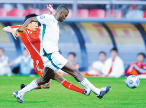 6月4日,在天津泰达体育场举行的足球友谊赛中,中国队以1比4负于沙特队。图为中国队球员毛彪(左)在比赛中与对方球员拼抢。 新华社发