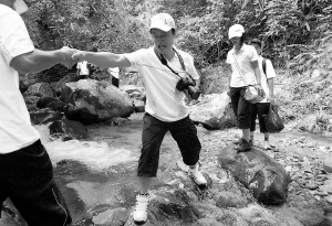| 六月四日,在五指山市水满乡,来自城里的年轻人一起沿着溪流进行野外徒步活动,既锻炼了身体,又能全程感受热带雨林的独特魅力。 本报记者 张杰 特约记者尹秋艳 摄 |
