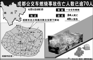 新华社成都6月5日电 6月5日8时许,成都市公交集团北星分公司一辆9路公交车在三环路川陕立交桥下桥处发生燃烧事故。初步统计已有25人遇难、76人受伤,其中特重伤6人,目前分别在成都二医院和成都军区总医院紧急救治。四川省政府已成立由副省长李成云为组长的“6·5”重大事故调查组,相关责任人将被严处。