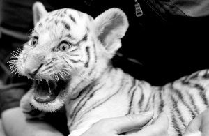 6月4日,在德国东部城市阿舍尔斯莱本的一家动物园,一只白虎宝宝在饲养员的怀里呲牙咧嘴。这只白虎宝宝是今年4月5日在这家动物园里出生的。 新华社/法新