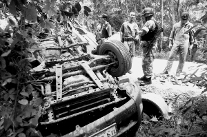 6月5日,在泰国南部北大年府,警察在被炸弹爆炸掀翻的汽车残骸旁查看。当地警方称,北大年府当天发生4起爆炸案,造成包括两名军人在内的5人死亡。 新华社发