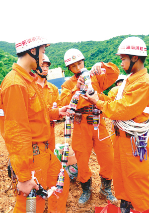 为了营救被困塌方隧道里的8名工人,救援指挥部决定打钻出一条生命通道,输送水、食品等。苏家雄和他的工人接受了此任务,从昨天下午6时开钻,连续工作了17个小时。