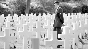 6月6日,一名美国军官在位于法国诺曼底的美军公墓向阵亡同胞致哀。今年6月6日是第二次世界大战盟军诺曼底登陆65周年纪念日。1944年6月6日,由美国、英国和加拿大等国部队组成的盟军在法国诺曼底登陆,开辟了第二次世界大战的欧洲第二战场。 新华社/法新