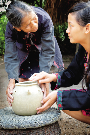 | 年逾80的羊拜亮(左)向曾孙女传授原始制陶技艺。 |