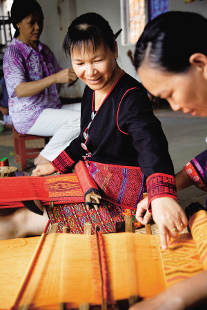 在五指山,黎族织锦传承人刘香兰带领全村的姐妹,办起了一家黎锦公司并有了黎锦传习所,村里的妇女捡起落满灰尘的腰织机,坐在传习所里织锦,十几个妇女靠织锦月收入都有近千元。