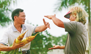 海南日报记者和金顺男说话间,金敬锡正从地里拔出根萝卜和李运福进行热烈地讨论。后来海南日报记者问李运福,金博士不是不太会说中文吗,你们怎么交流的?李运福说,都是农业上的东西,大概也能听懂。