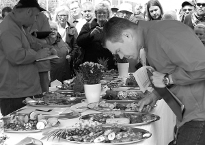 ←6月6日,在芬兰首都赫尔辛基举办的全国烧烤比赛中,评委们品尝参赛选手的烧烤大餐并打分。当日,芬兰最大的肉类加工公司阿特里阿公司在赫尔辛基市中心的广场举行一年一度的芬兰全国烧烤比赛。 新华社发
