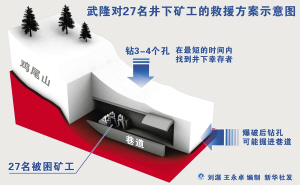 据新华社重庆6月8日电 (记者李松 徐博 王晓磊) 记者从重庆武隆县鸡尾山垮塌抢险现场了解到,目前对27名井下矿工的“双管齐下”救援方案已经基本确定。矿山救护队员将在两个地点同时钻孔,其中一个经过爆破后钻孔并可能掘进巷道,另一个直接沿垂直方向钻4个孔,以求在最短的时间内找到井下幸存者。