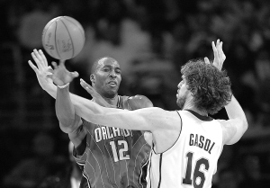 6月8日,在NBA总决赛第二场比赛中,湖人队经过加时赛以101:96击败魔术队,取得两连胜。图为加索尔(右)防守霍华德。 新华社发