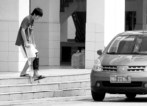 ←6月8日中午,海口市第一中学高中部考点,一位在考前打篮球摔伤了腿的考生走出考场。