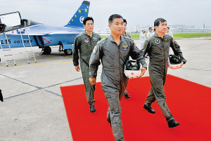 6月8日,执行此次飞行任务的首席飞行员杨耀(前右)、郭彦波(前左)等首飞成功后走下飞机。 当日,由中航工业江西洪都航空工业集团有限责任公司自主研制的猎鹰(L15)高级教练机05架在江西省南昌市青云谱机场首飞成功。 新华社发