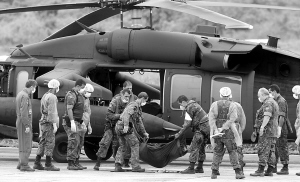 6月9日,在巴西费尔南多-迪诺罗尼亚岛的一个空军基地,巴西空军士兵将法航失事客机遇难者遗体抬下飞机。 新华社/路透